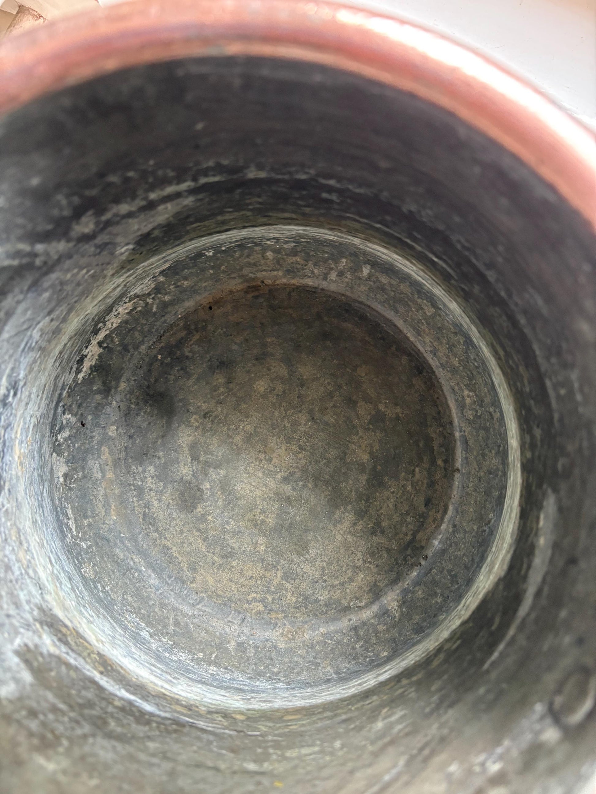 This bucket is in fantastic condition, it has a beaten copper effect to it,no holes or dents, just patina and verdigris adding character to this charming piece. An interesting bucket, very elegant in design with its tapered top and slightly flared base, and with the initials B.A.K stamped to the top rim - I wonder what they stood for ?