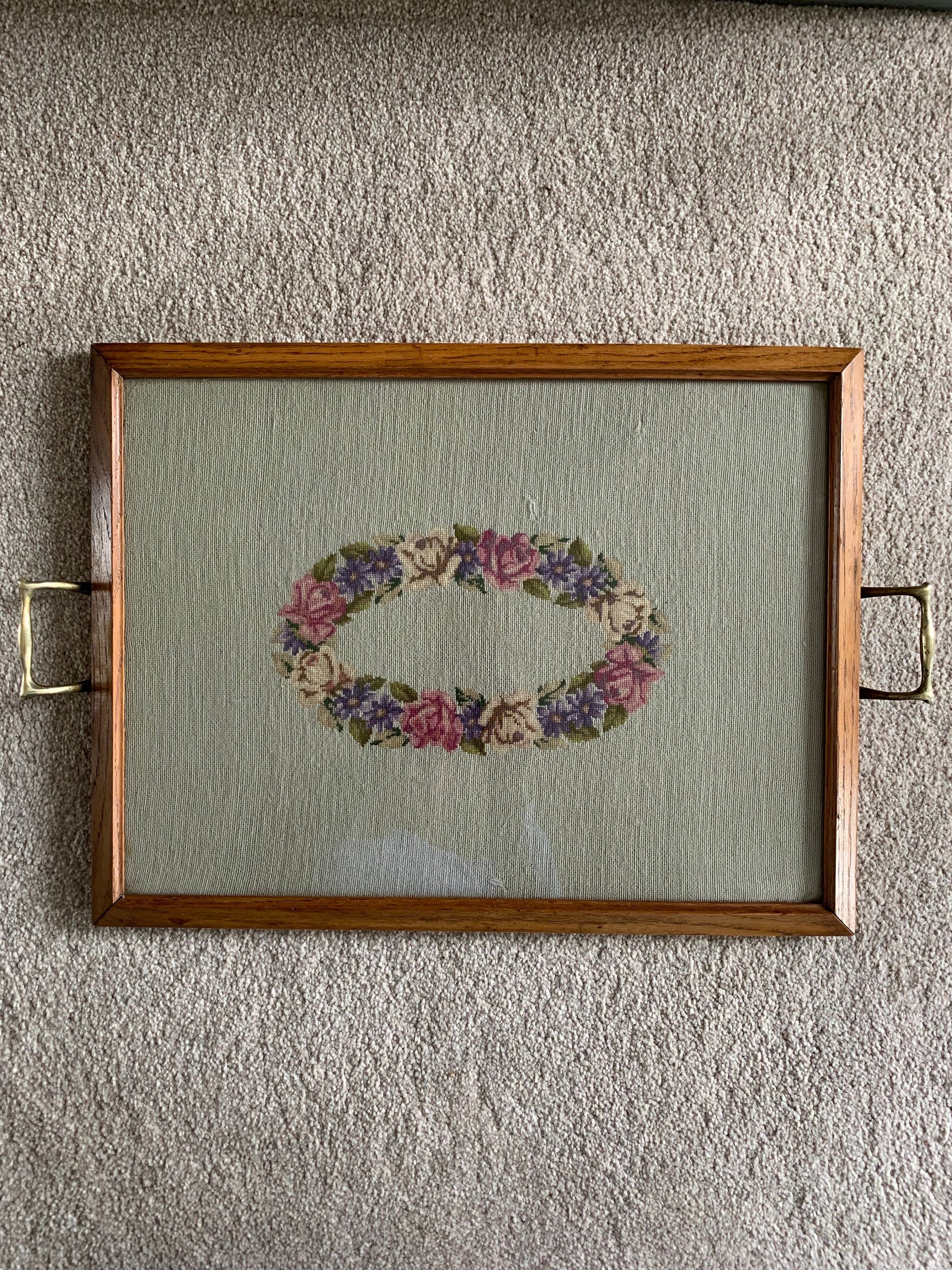 A Vintage item so please expect wear and tear, there are a couple of snags to the tapestry where a few stitches have come away. Very pretty pattern of flowers, in pinks and mauves on a sage green background.