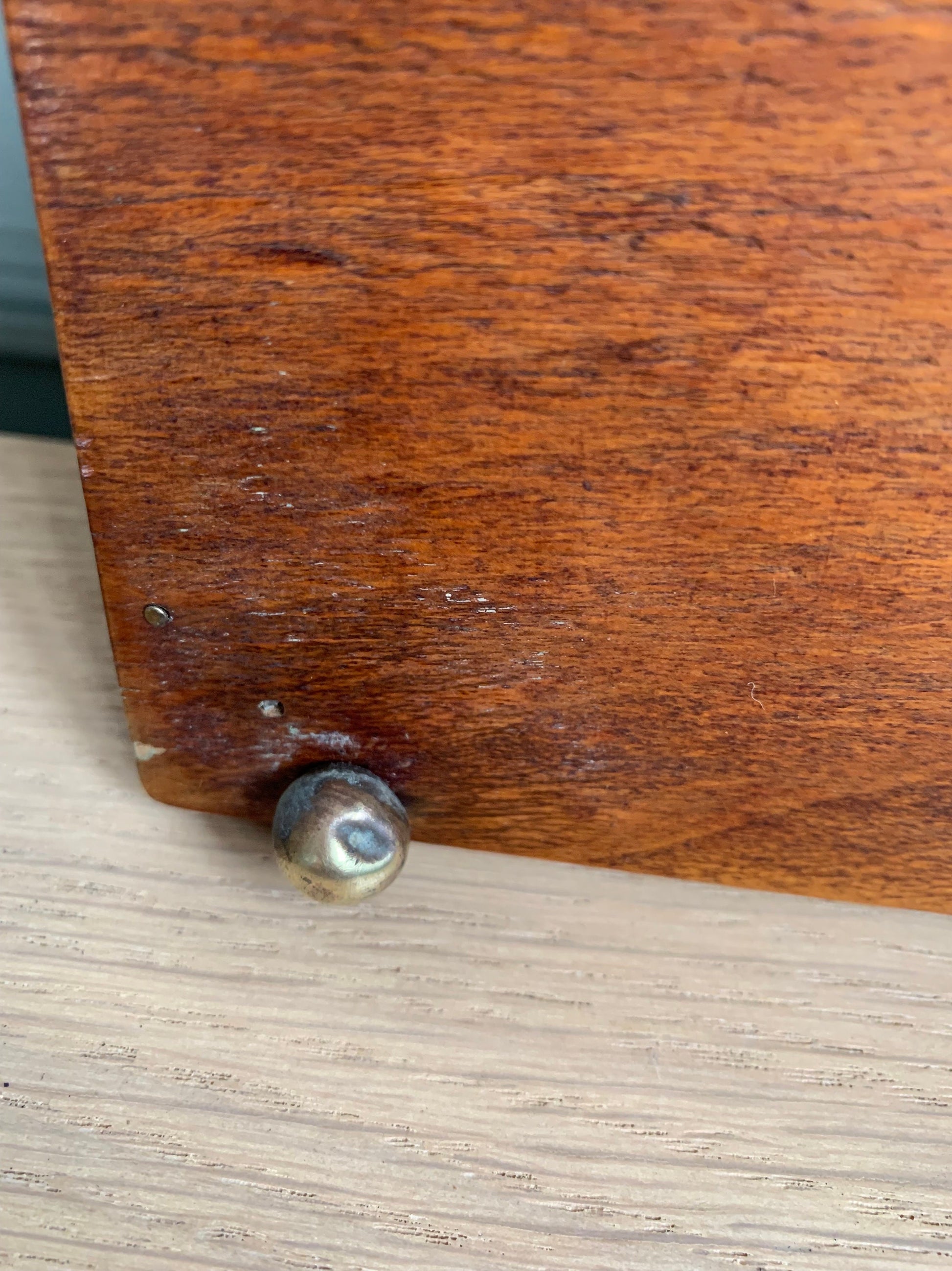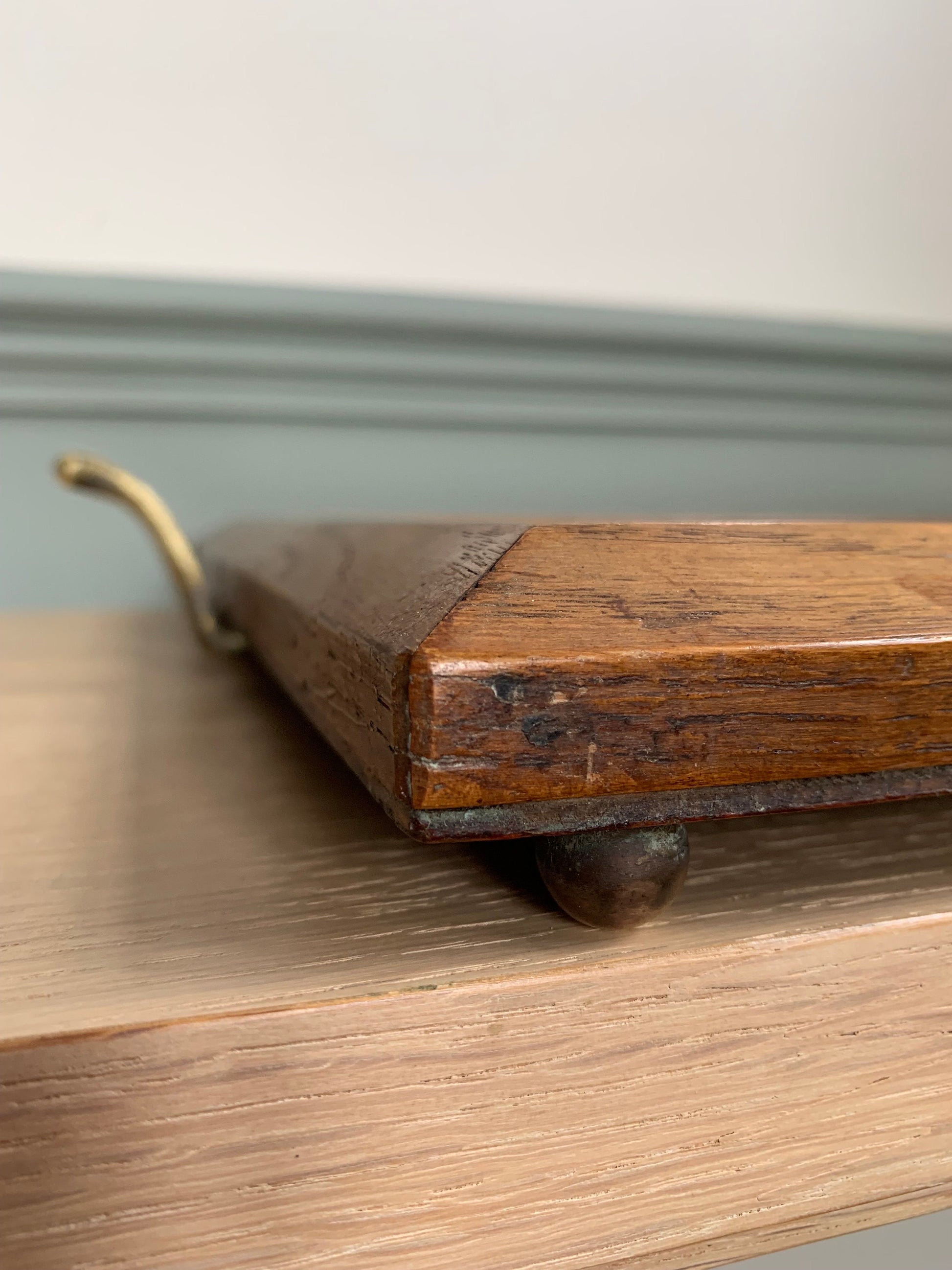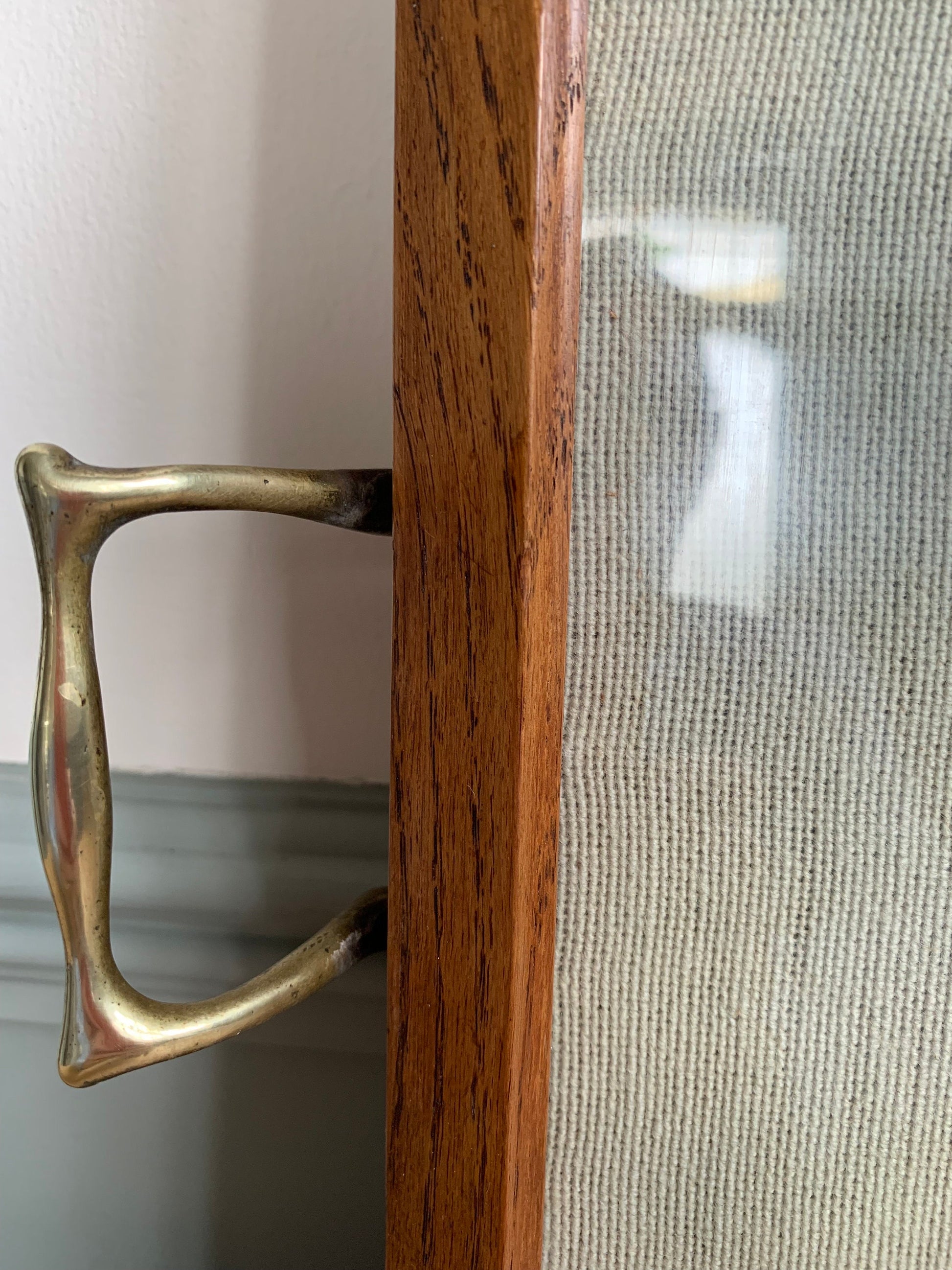 A beautiful tea tray with a very pretty tapestry behind the glass top. Two side handles made of brass and sits on four bun feet.