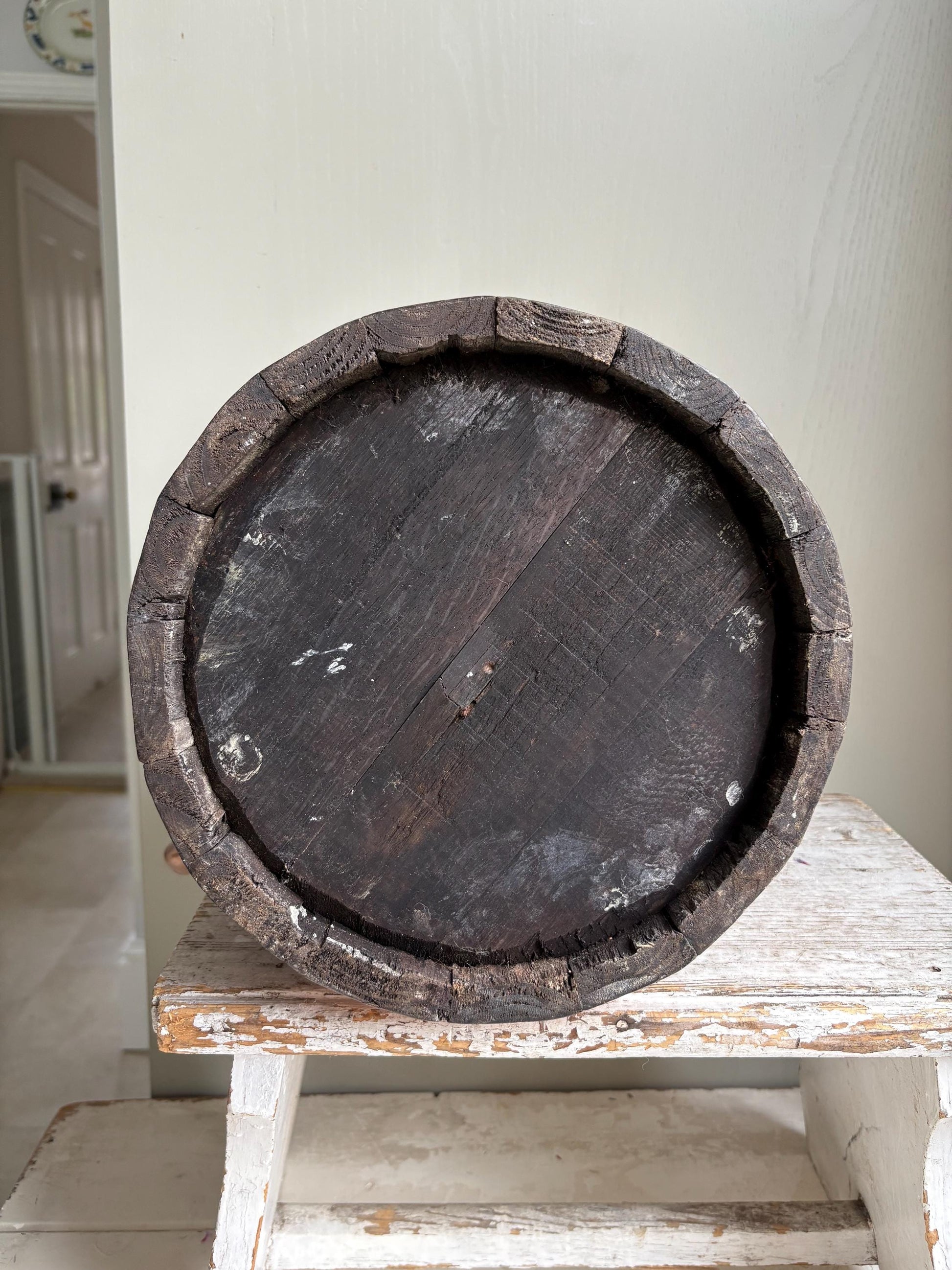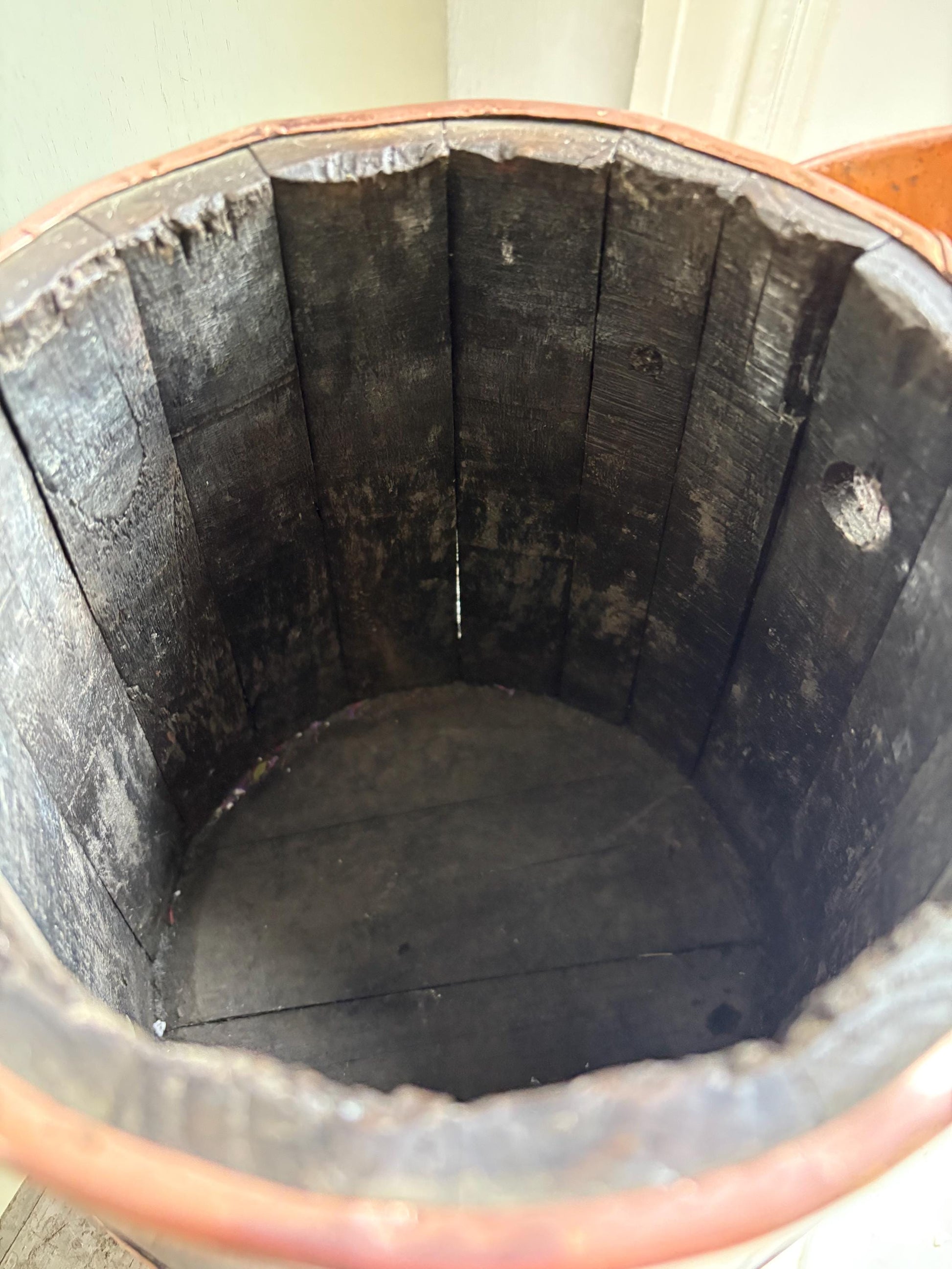 This jug is no longer watertight due to its age, as the wood has aged some of the slats have slightly shrunk, however because it is such a large jug you could easily fit a vase or other vessel inside to display fresh flowers.