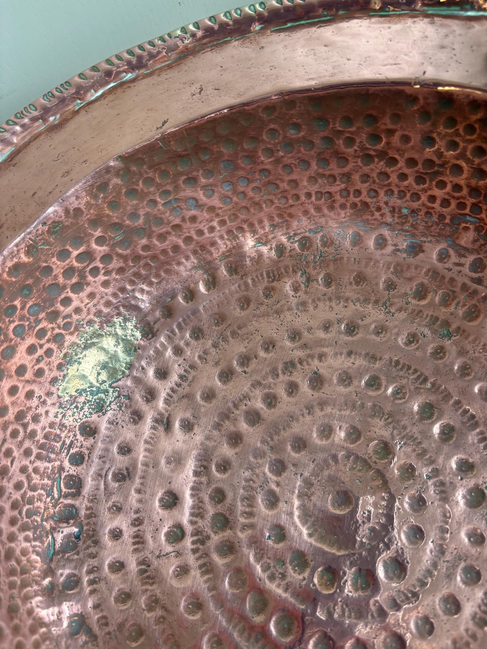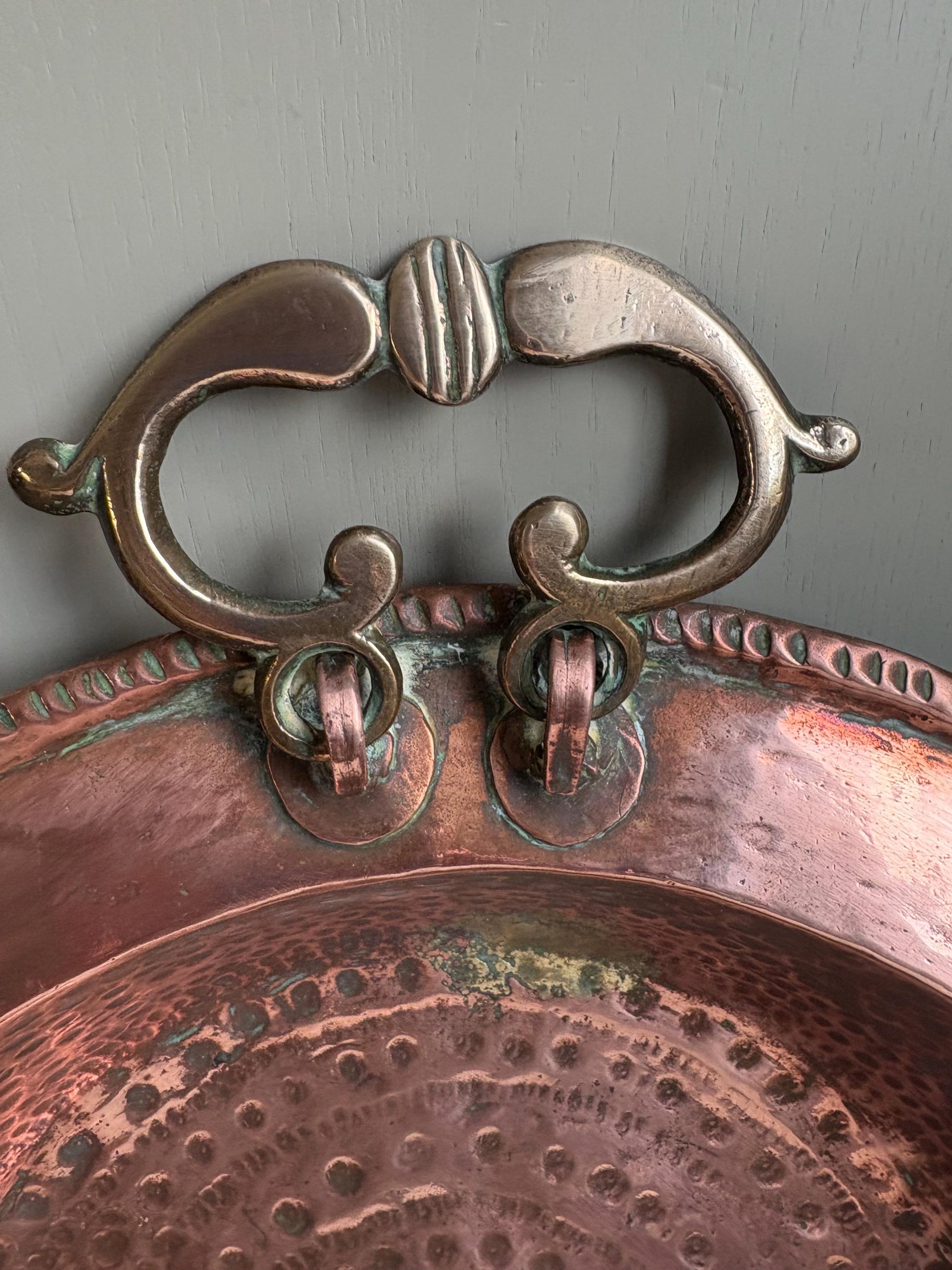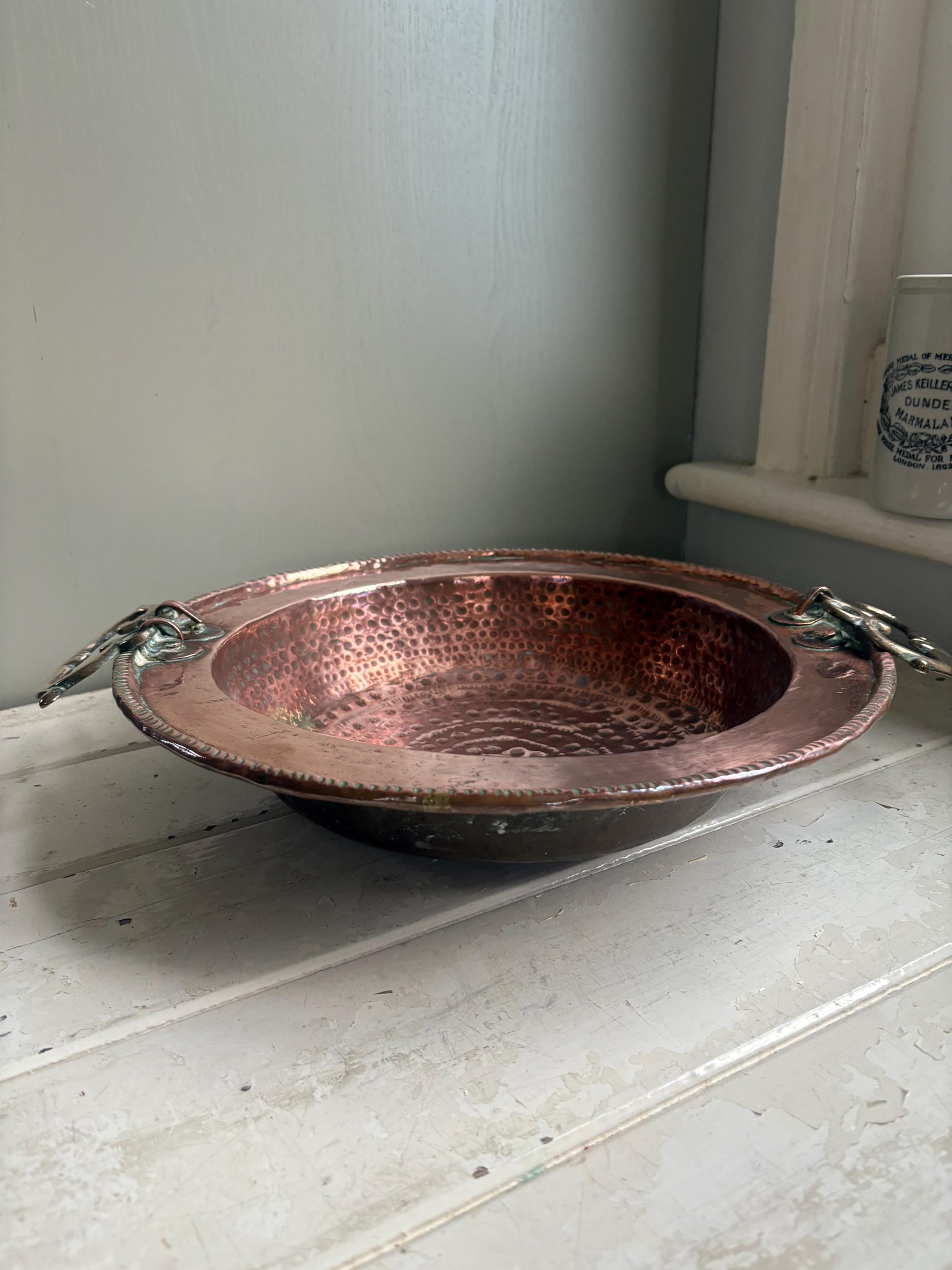 This bowl has a hammered pattern to the base, it has two side handles, one of which has lost the ring that holds it in place, please see photos.