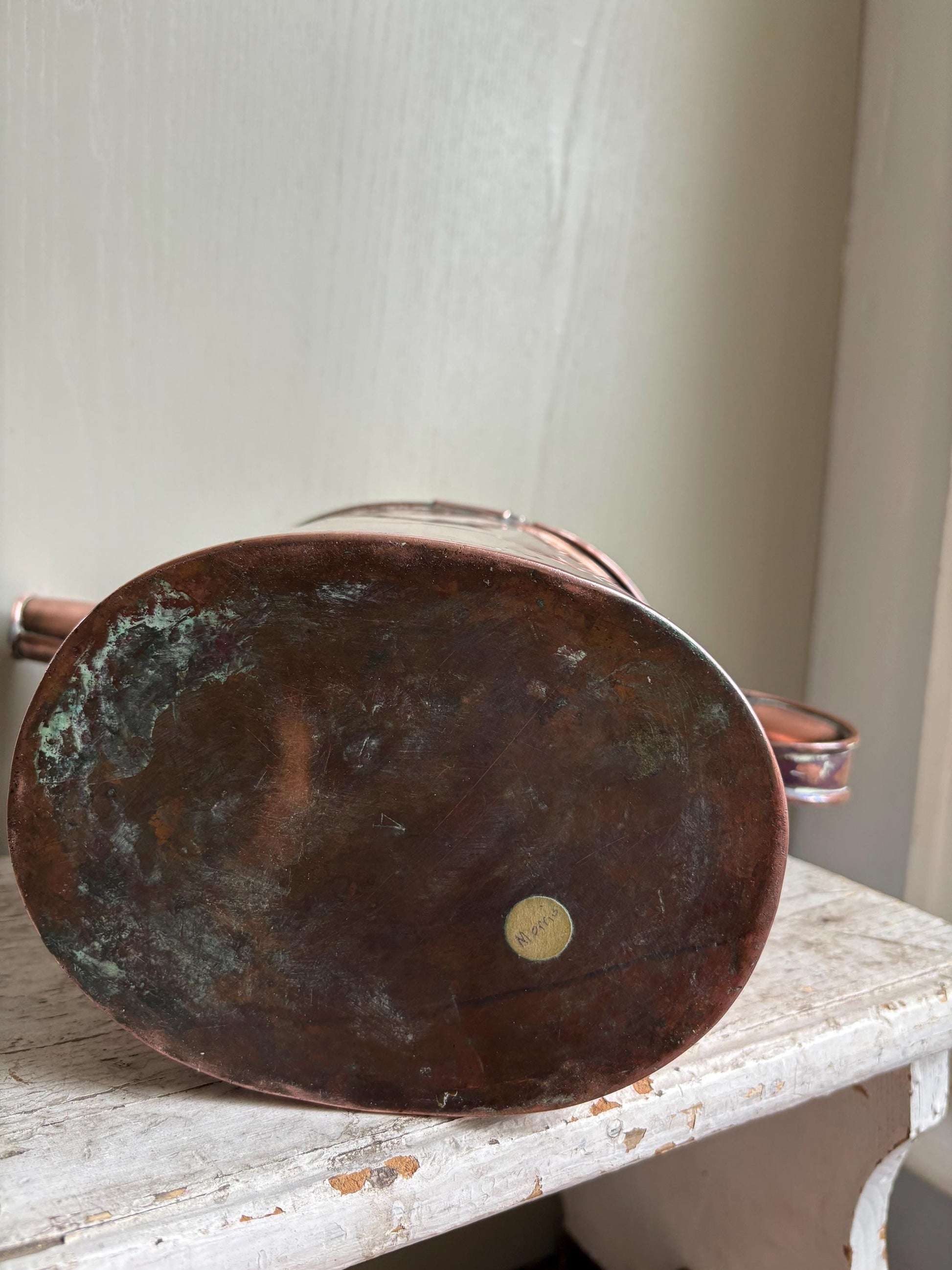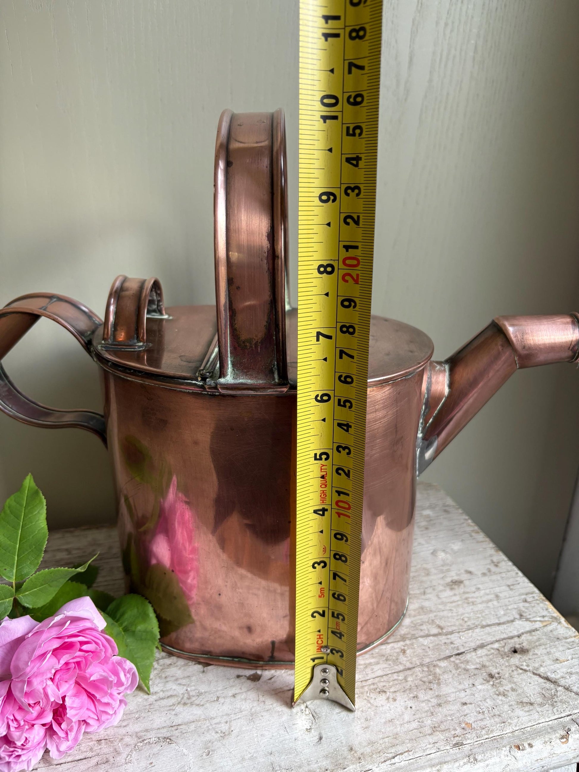 This lovely old copper vessel has had many years of use, some visible repairs around spout area and dents to the copper, would make a great display piece or could be used for fresh flower arrangements as it still appears to be watertight. Great for cottage or farmhouse decor.