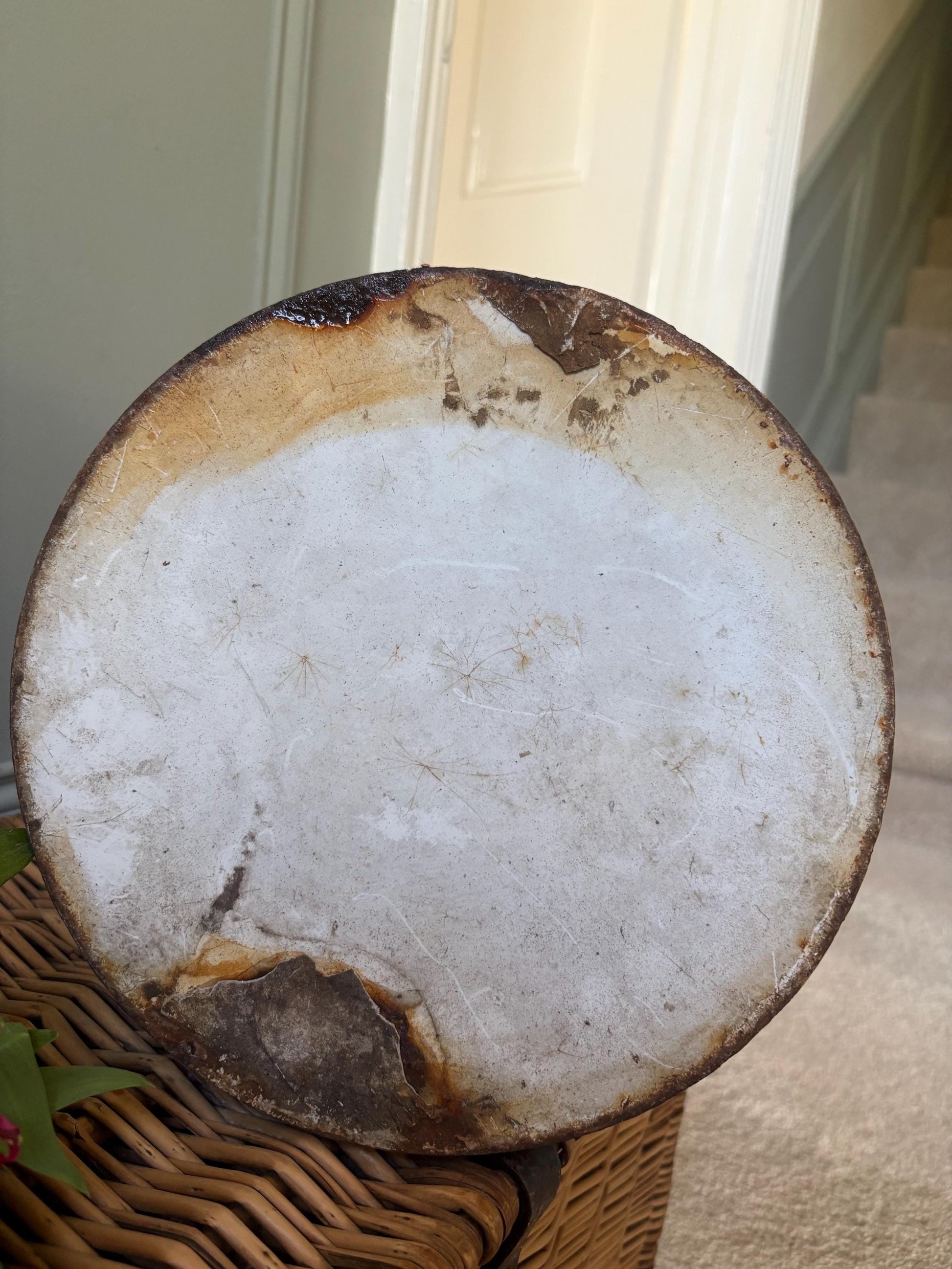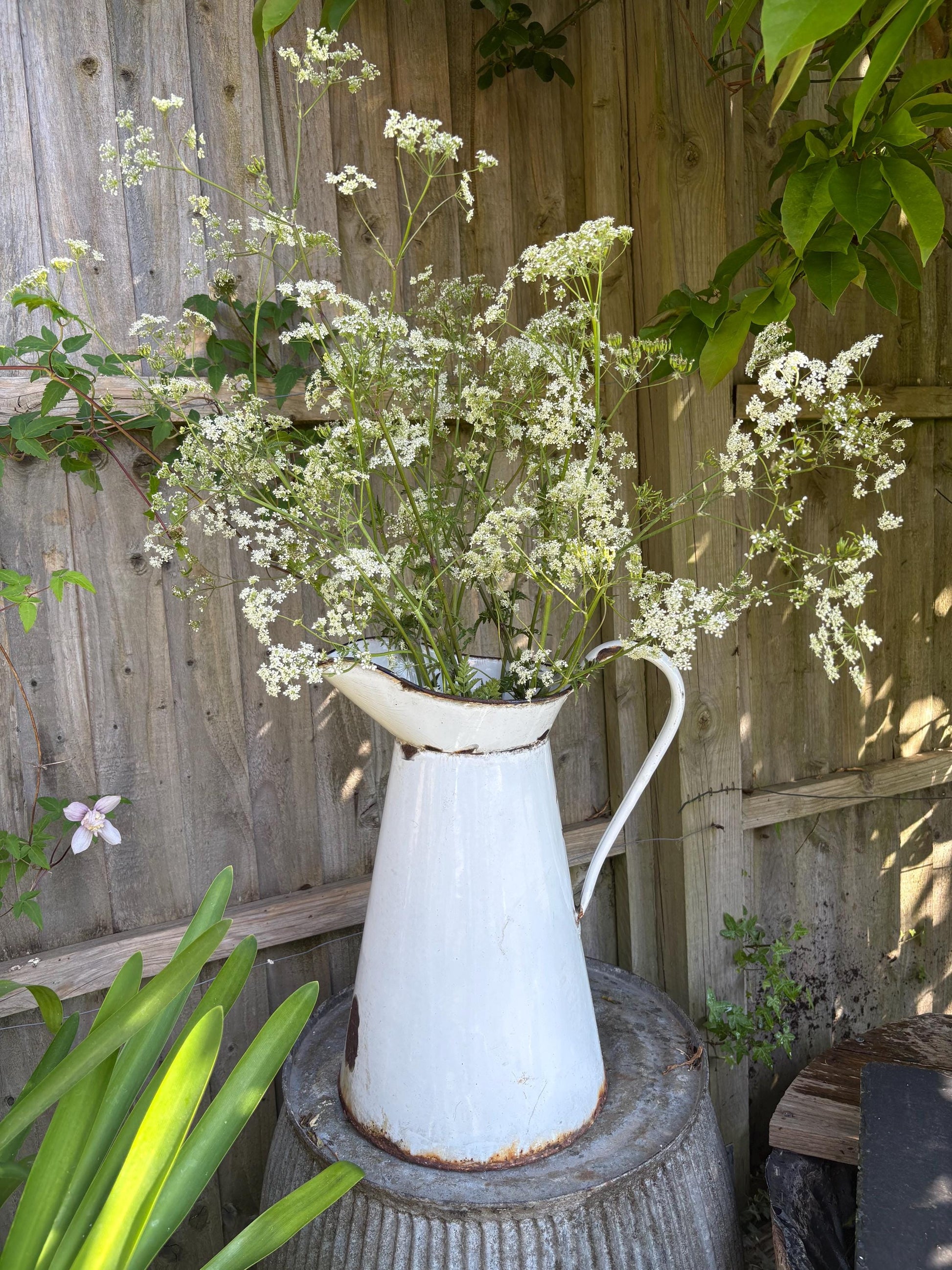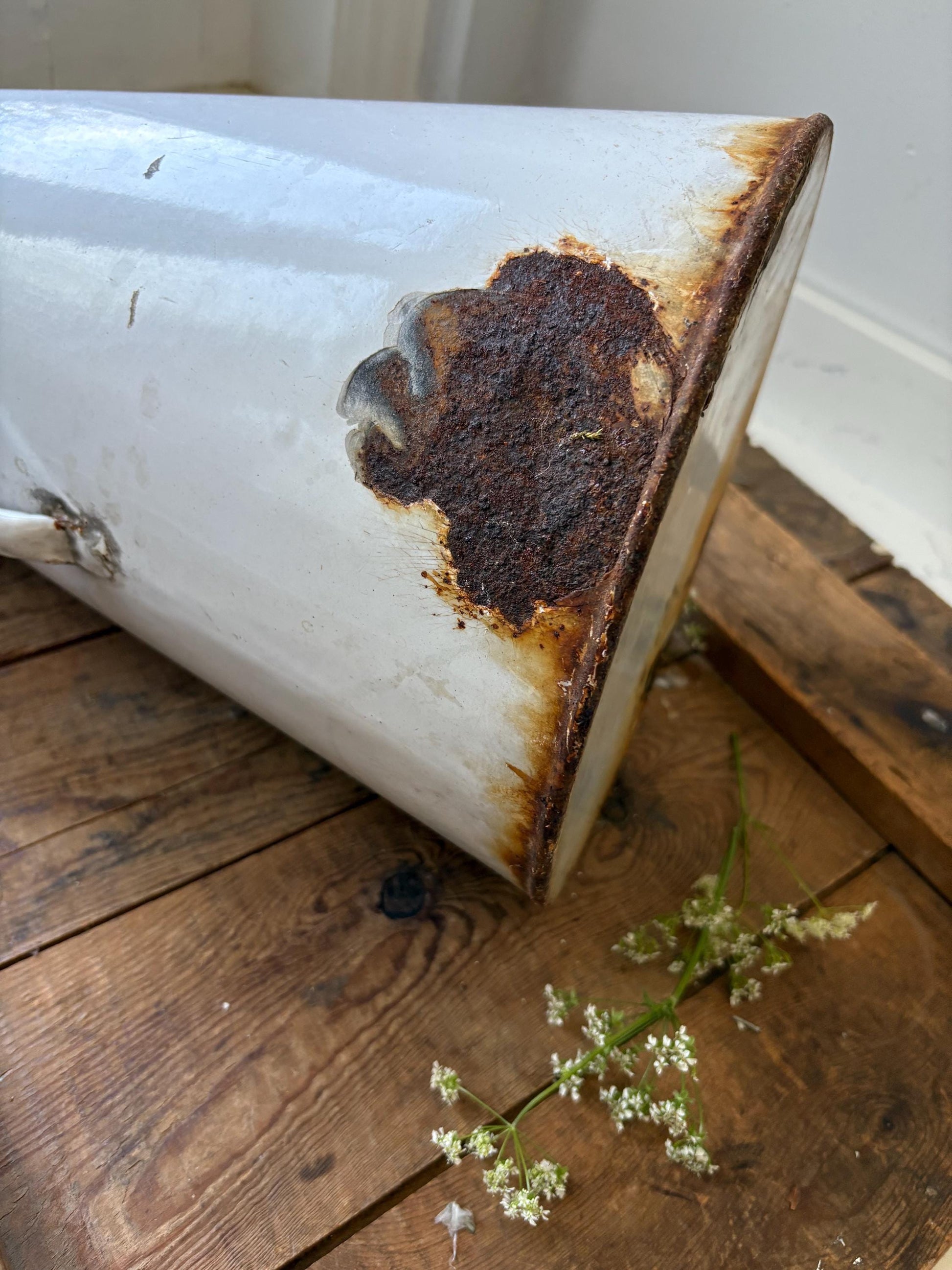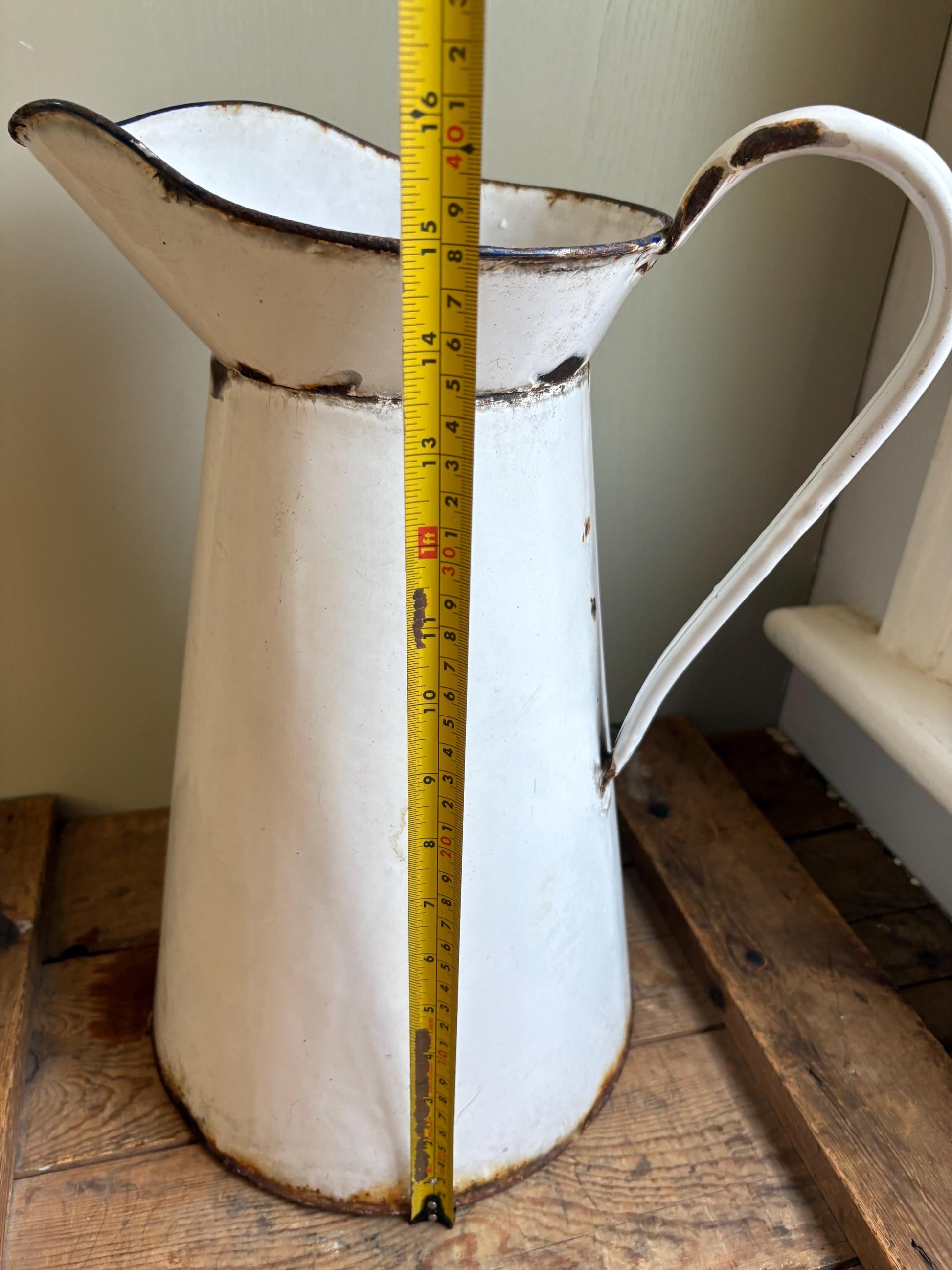 This old jug is in worn condition, hence the price . There is lots of rust damage and chipping to the enamel, and is leaky at the base. As this jug is so large you can easily fit a vase inside so you can still use it to display fresh flowers in for a very shabby chic style.