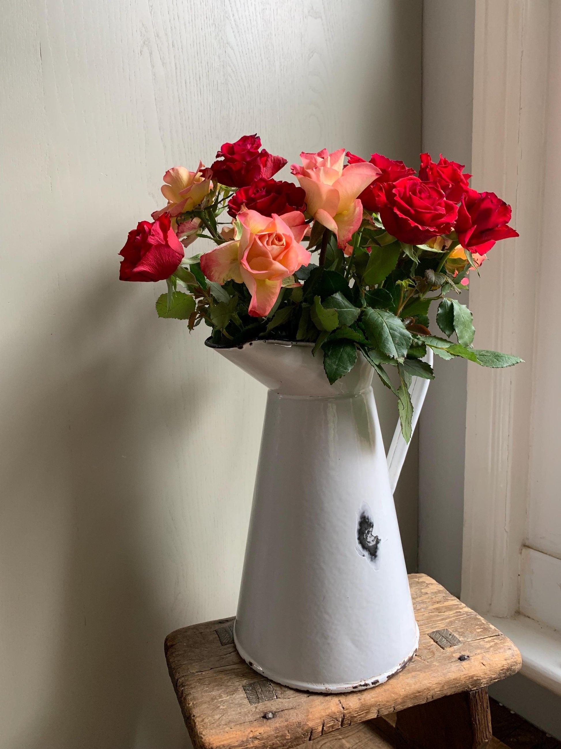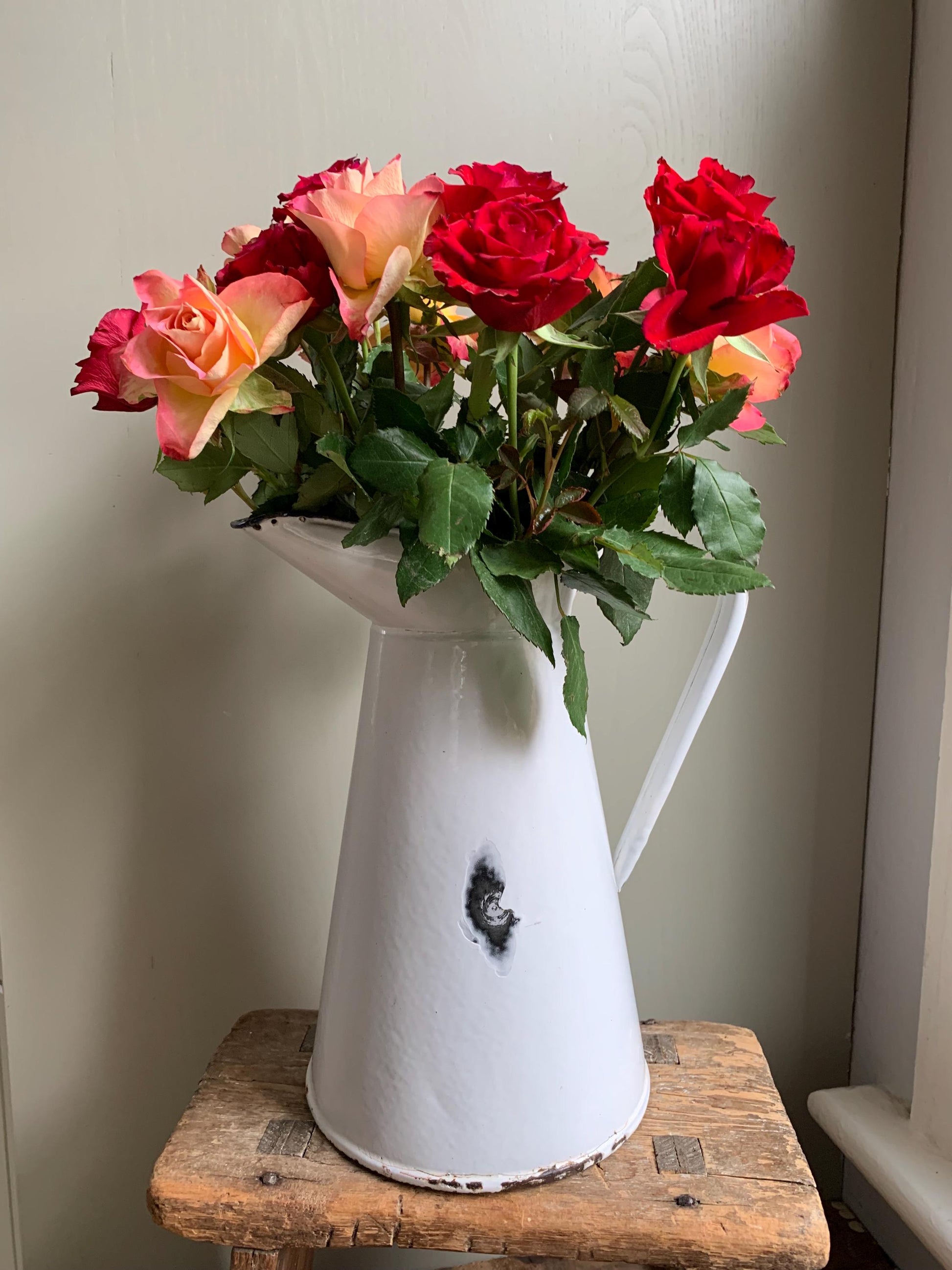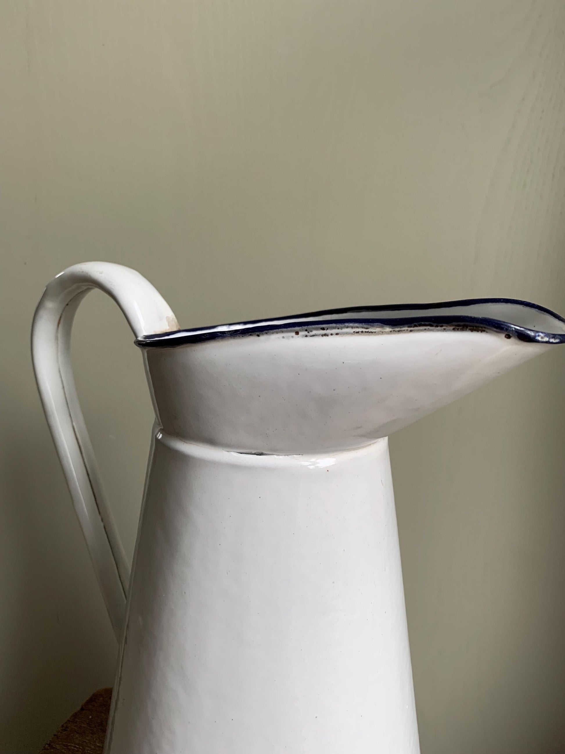 A lovely vintage enamelware jug in a traditional style with dark blue trim.