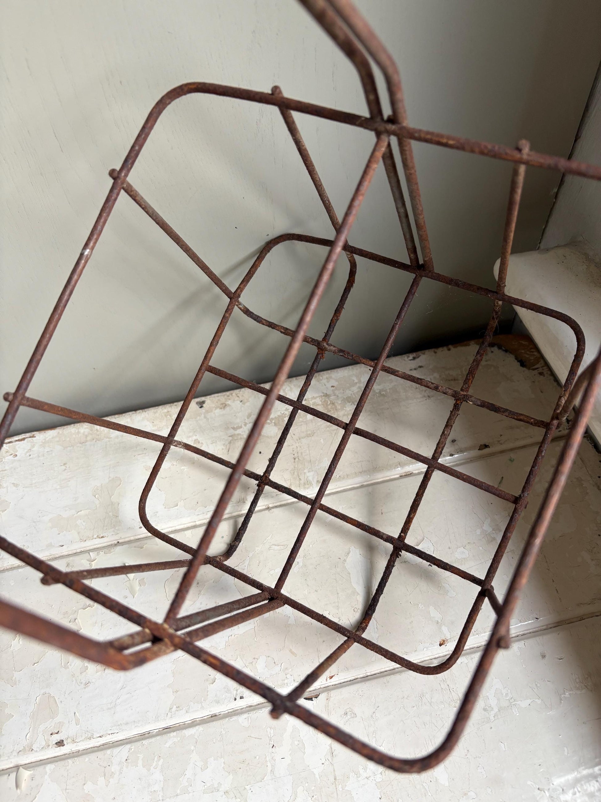 Holds four wine bottles, metal is rusted but otherwise in good condition, all joints/joins still fixed. Has a lovely wooden handle.