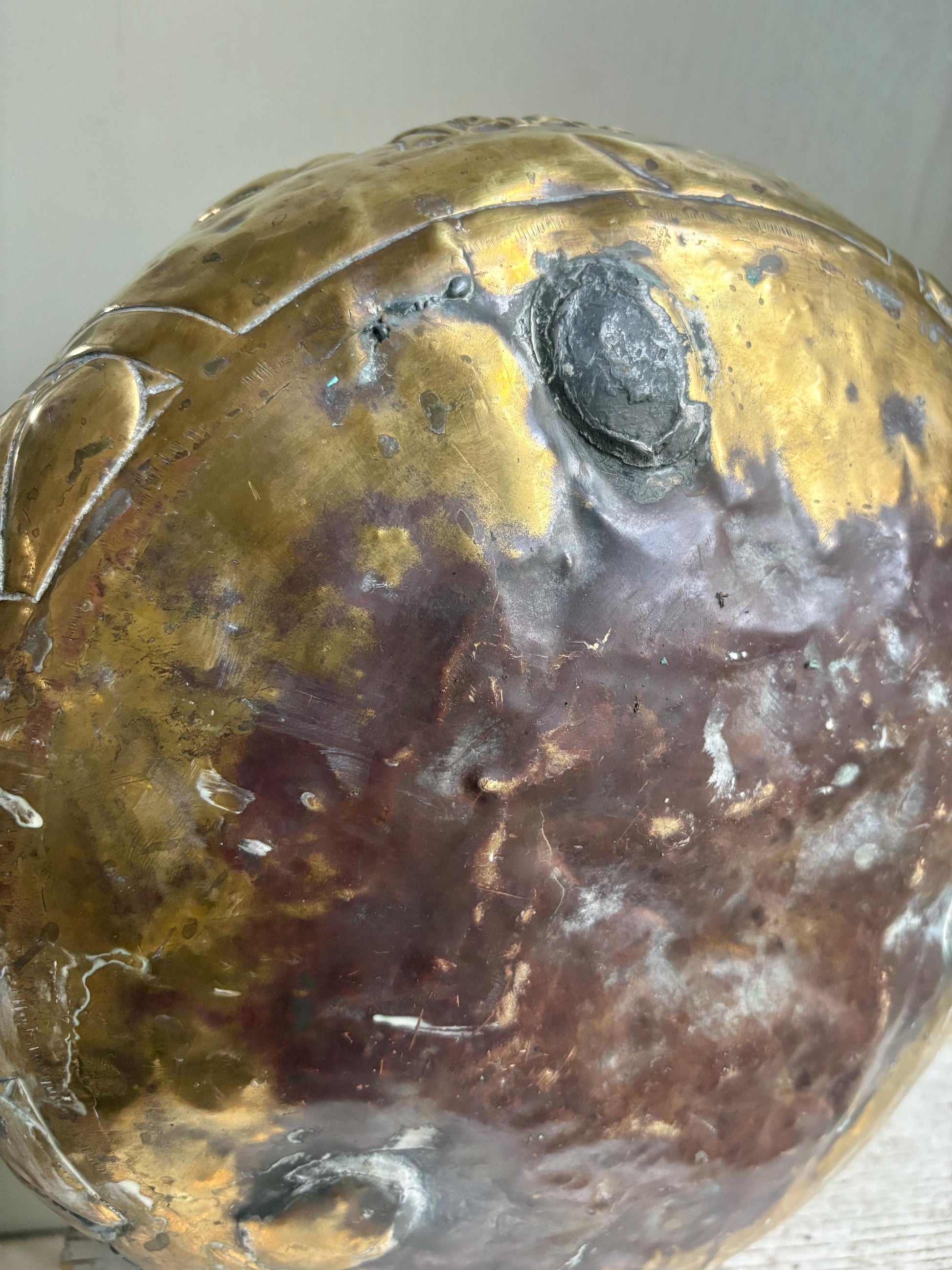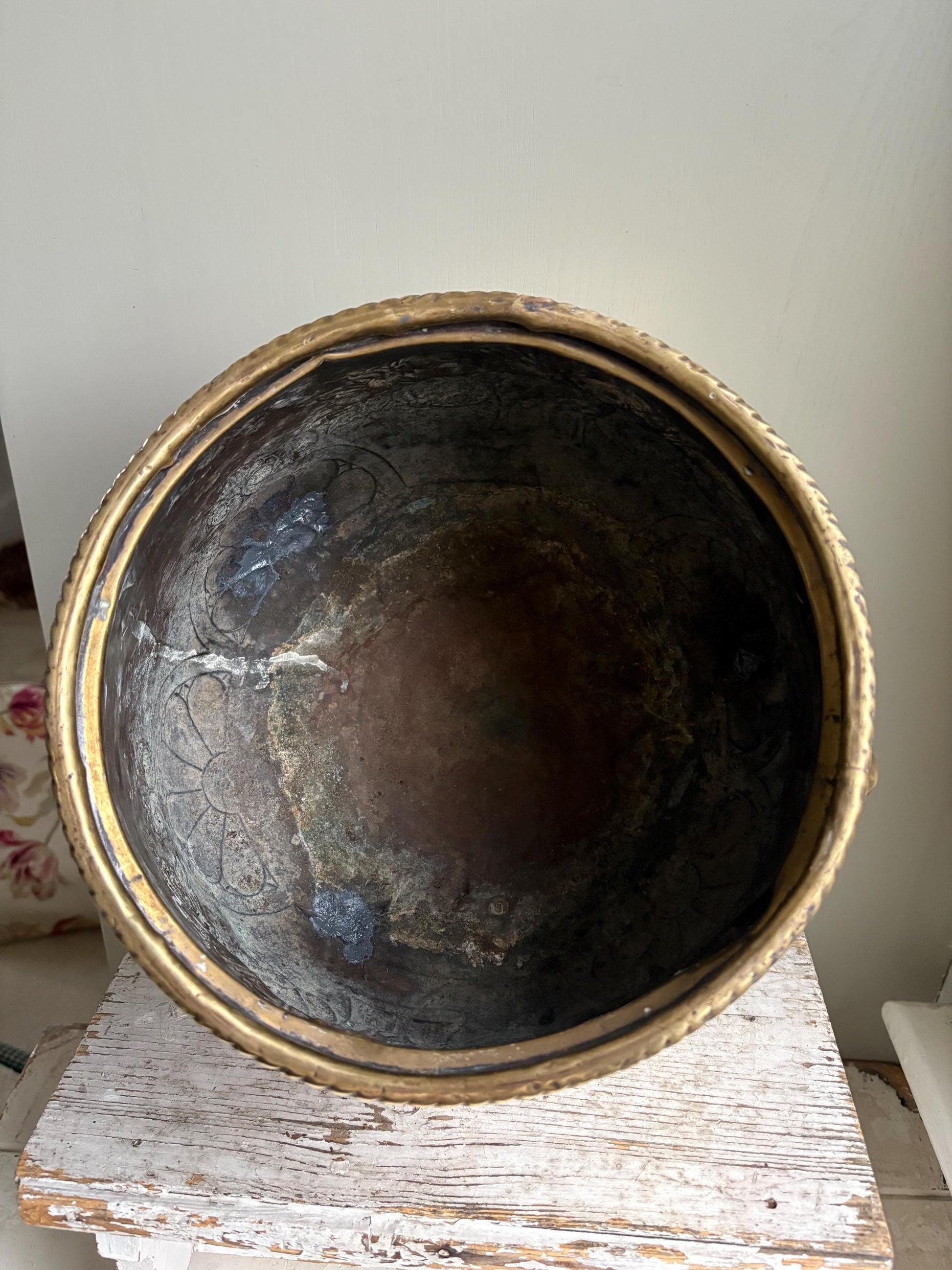 This is very old and has much wear and tear hence the price. Still very useful and useable. It has had repairs, if using for indoor plants you could put a tray/ saucer in the base in case of leaks. The base is rounded and has knocks/dents to it so has a bit of a wobble when empty. The body has some dents to it and a couple of small holes one on lion head and rim.