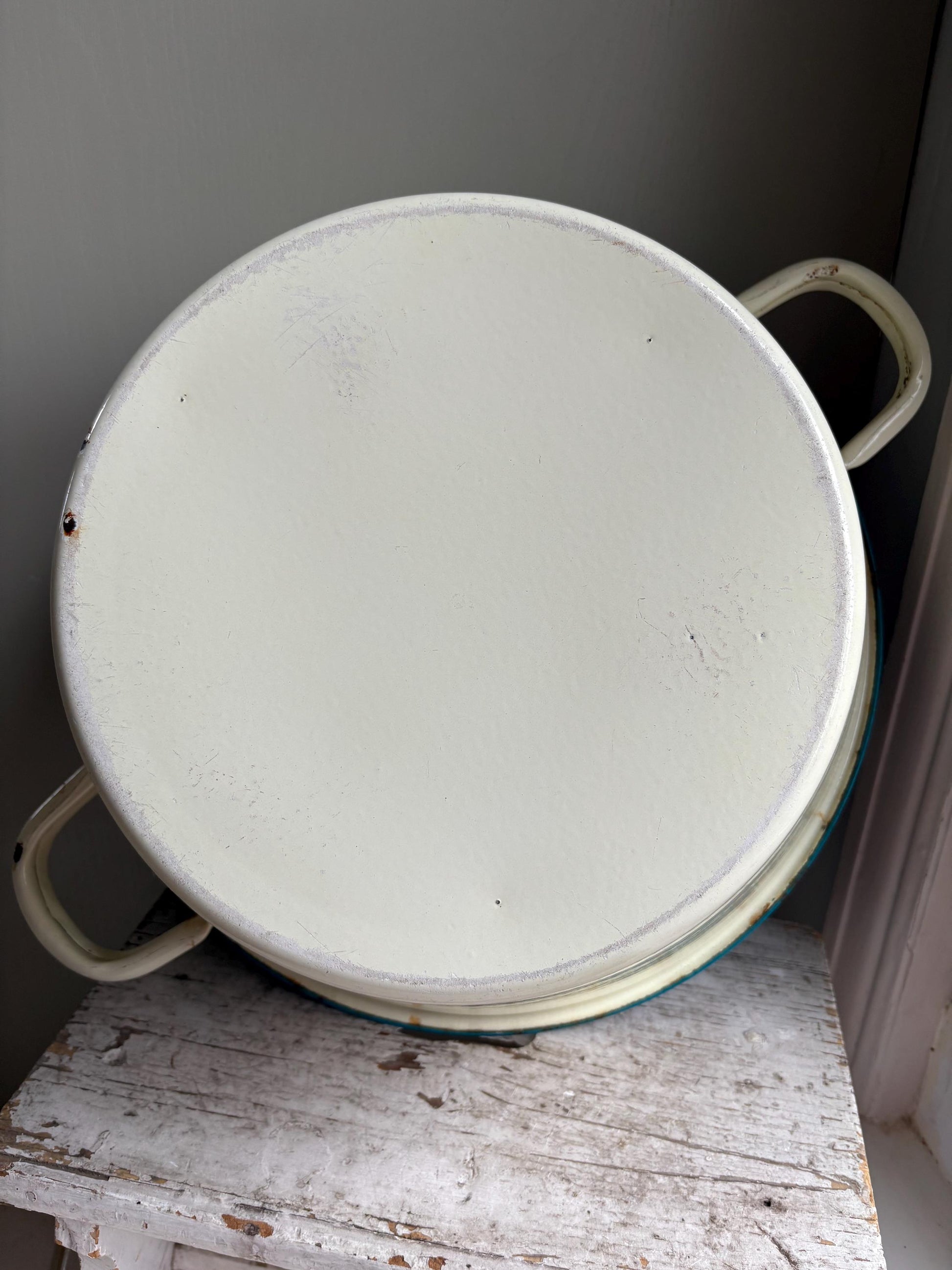 This bowl is in great condition, it has two side handles and a lovely speckled grey colour inside. The outer of the bowl is a cream colour with a beautiful turquoise blue rim.