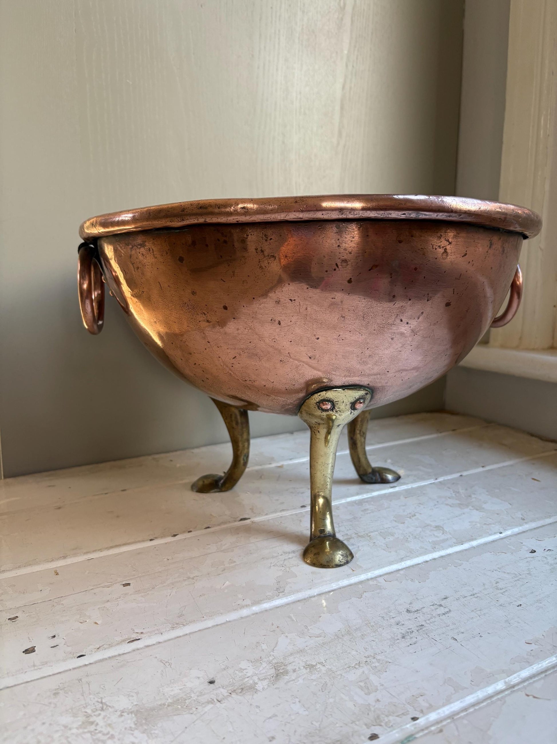 The large bowl sits on three very solid thick brass legs, attached with copper rivets, all very sturdy. It has a thick rolled rim and wonderful ring side handles.