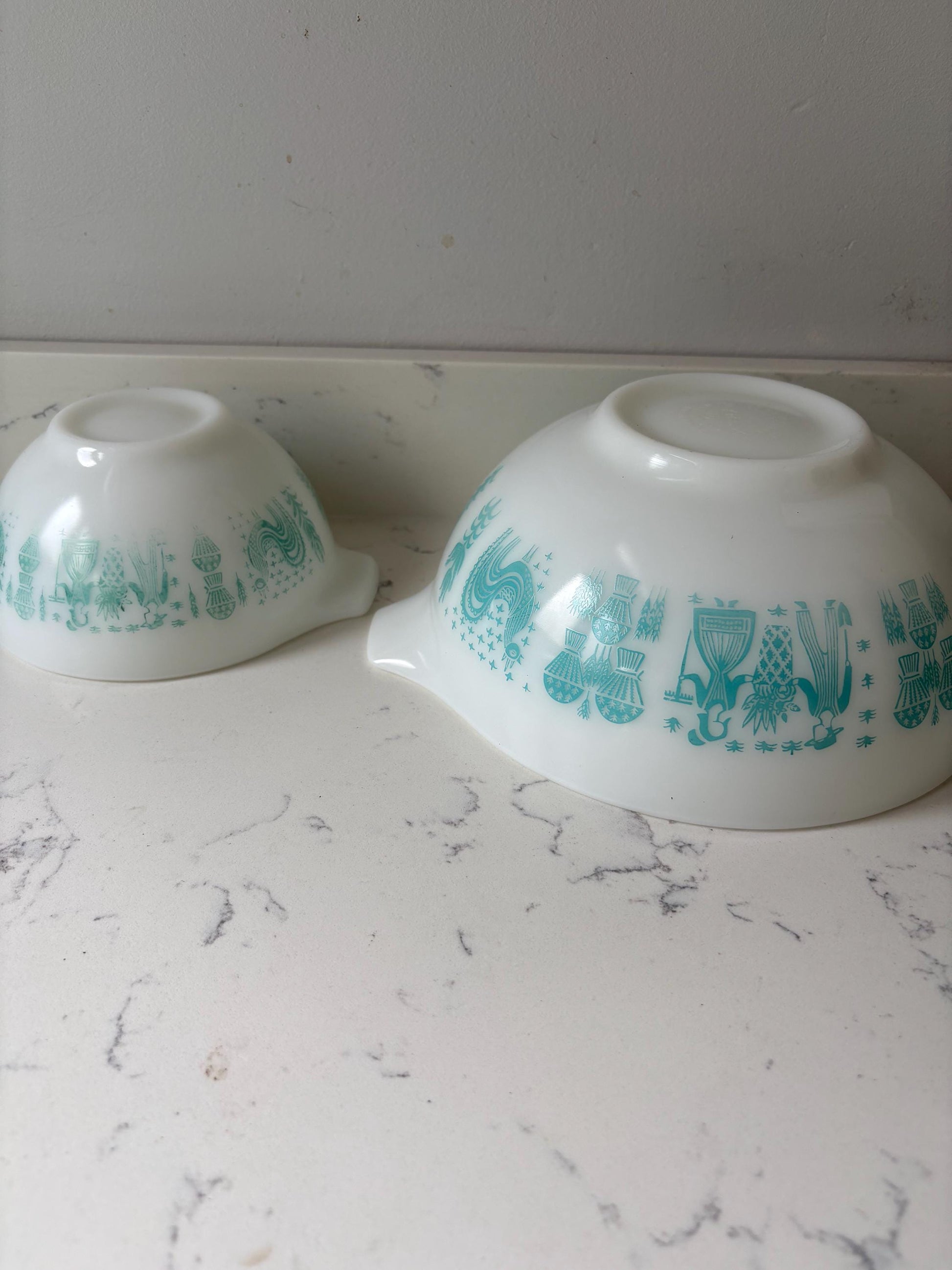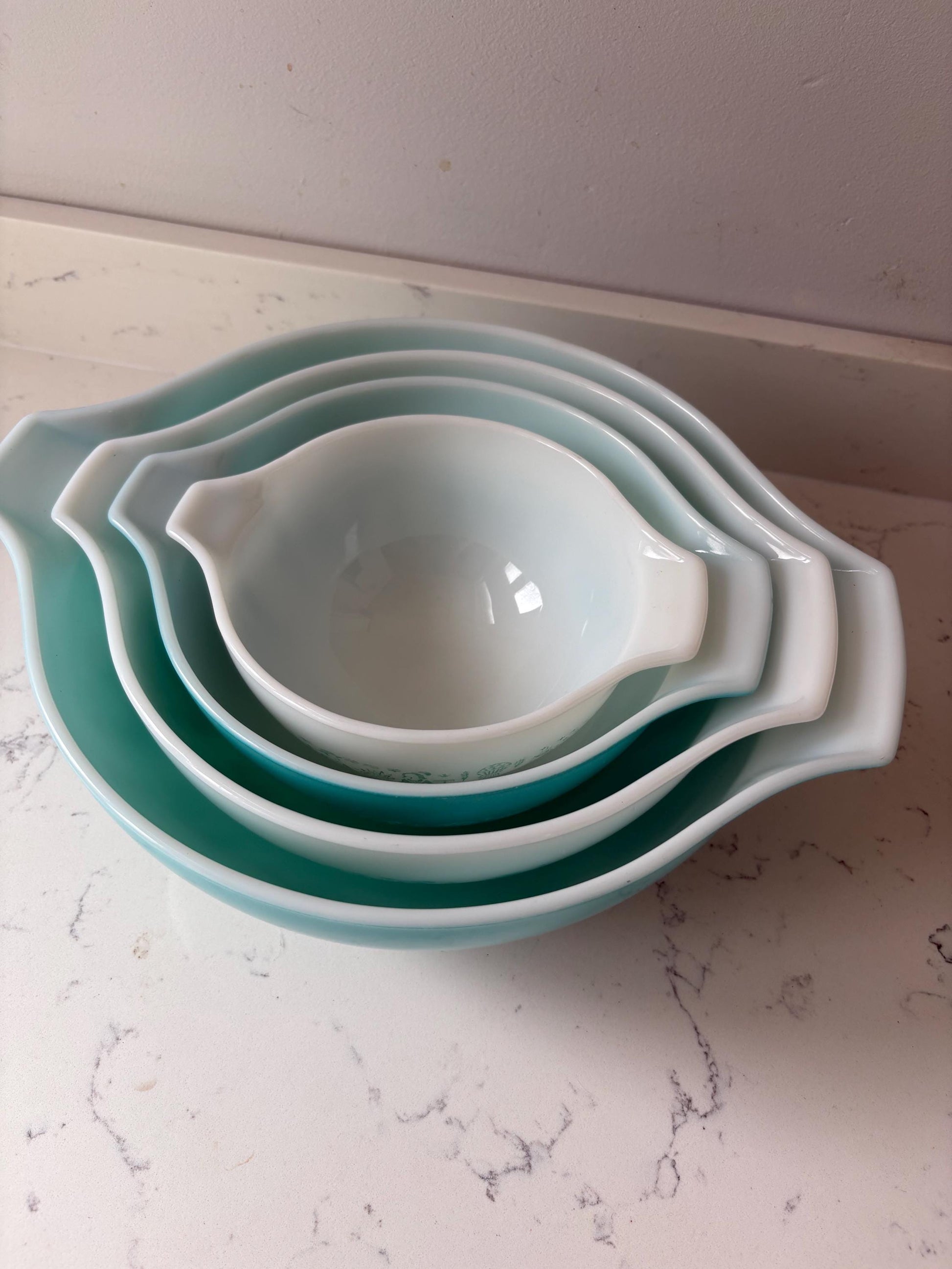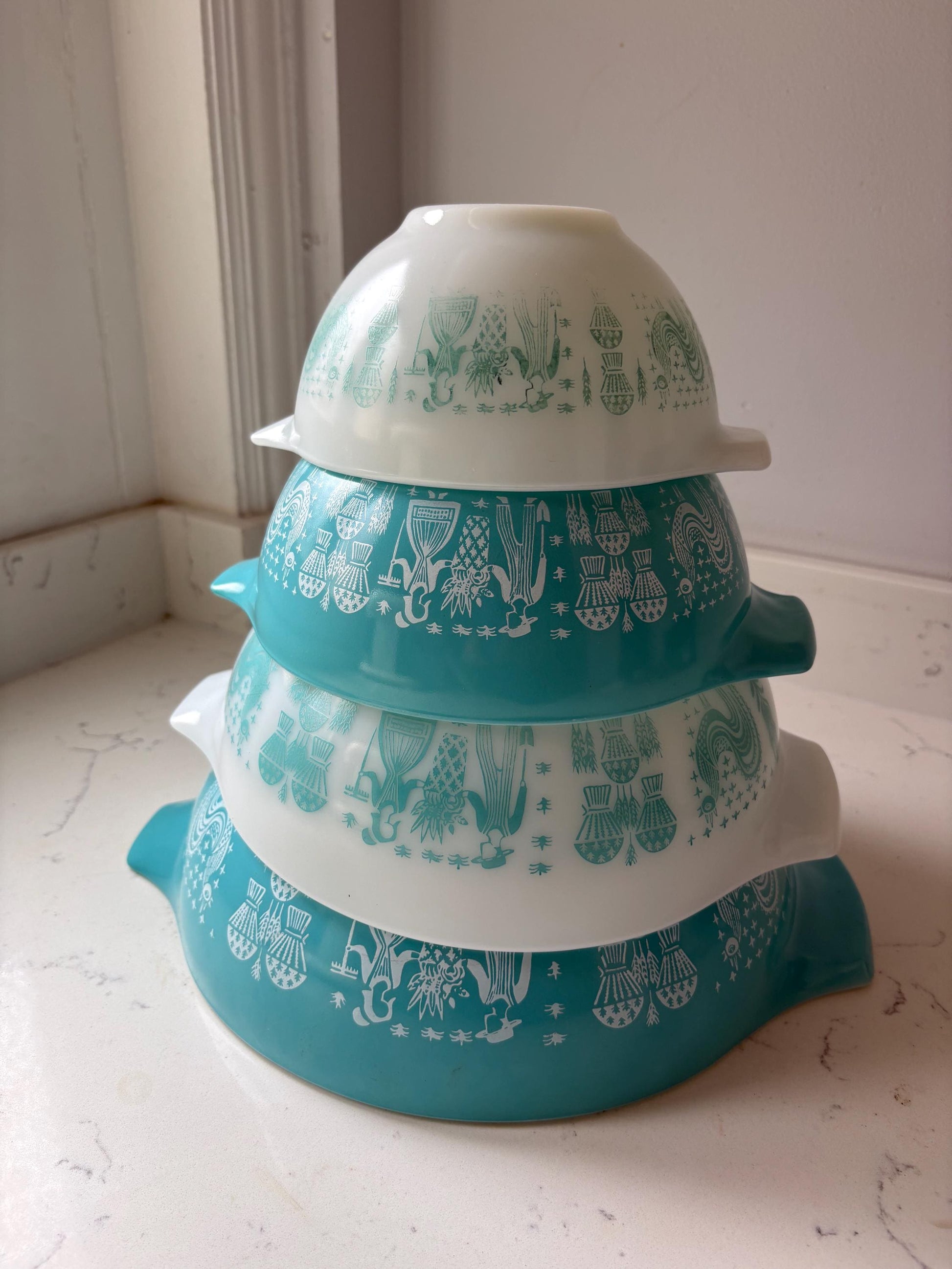 PYREX Amish Butterprint Turquoise Cinderella Nesting Bowls.